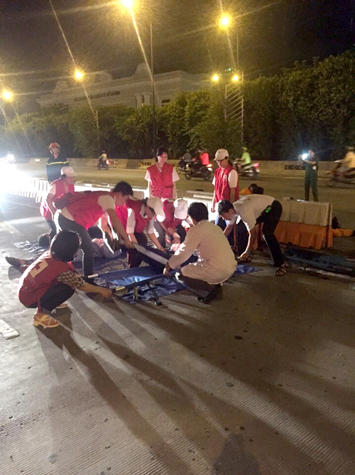Đội cứu hộ tại chỗ hỗ trợ đưa các nạn nhân ra ngoài trong buổi tập luyện