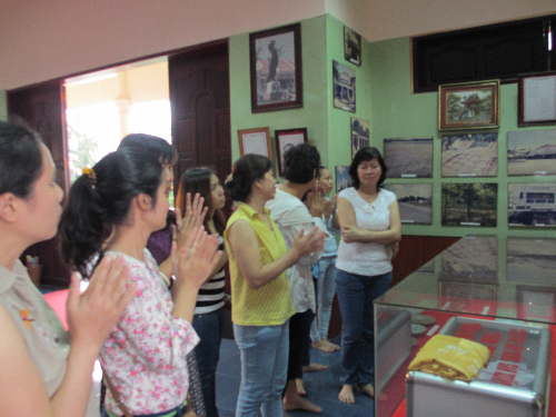 Các chị em đang nghe kể về lịch sử anh hùng liệt sỹ Võ Thị Sáu tại nhà tưởng niệm