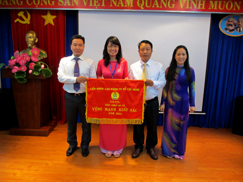 Bà Vũ Thị Ngoãn tặng cờ thi đua của Liên đoàn lao động thành phố