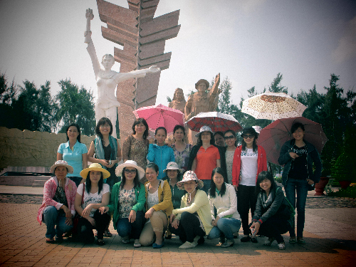 Nữ CBVCNV chụp hình tại tượng đài Bà Nguyễn Thị Định - Bến Tre